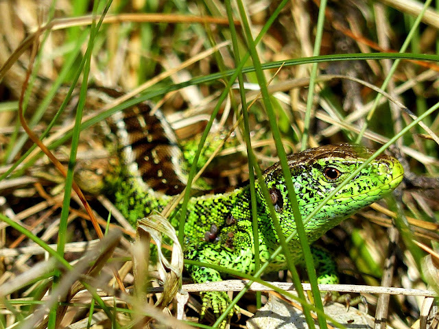 Ik ga van het pad af en hoor even verderop geritsel in de struiken en even later zie ik een mooie zandhagedis. Hij blijft heel stil zitten in de hoop dat ik hem niet gezien heb...Mooie kans voor mij om even snel wat foto's te maken.
